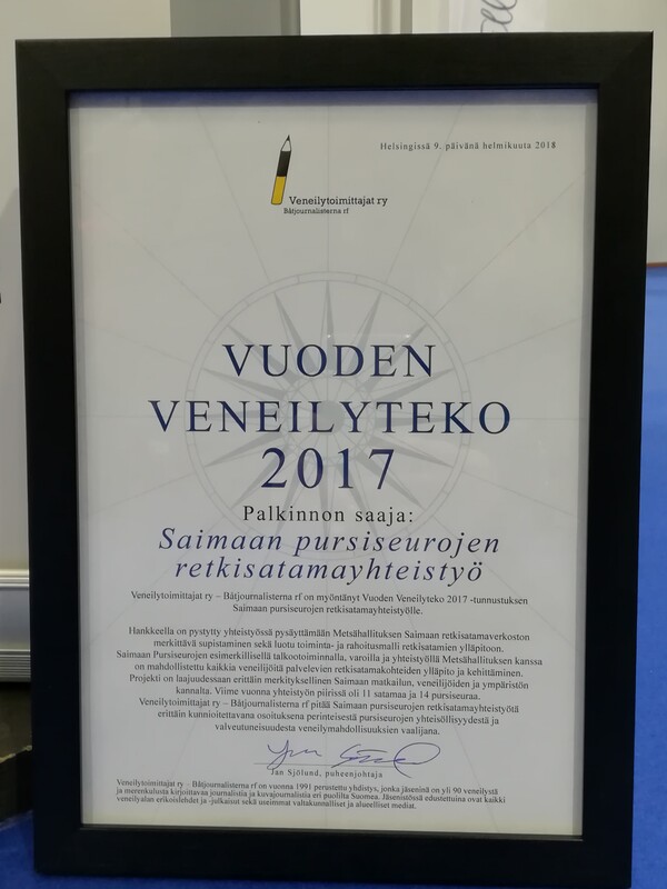 Saimaan Pursiseuroille on myönnetty valtakunnallinen Vuoden veneilyteko 2017 palkinto retkisatamayhteistyöstä Metsähallituksen kanssa. Palkinto luovutettiin Vene 2018 messuilla 9.2.2018 ja sen kävi vastaanottamassa Saimaan Pursiseurojen puolesta Jan Jansson, Kuopion Pursiseurasta.